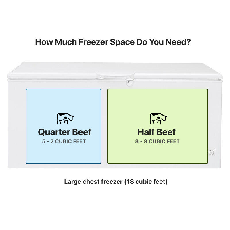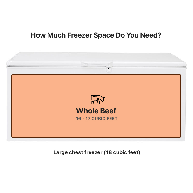 A whole beef will need 16 - 17 cubic feet, half will require 8 - 9 cubic feet, and a quarter will need 5 - 7 cubic feet. For reference, a large chest freezer is typically 18 - 20 cubic feet large.